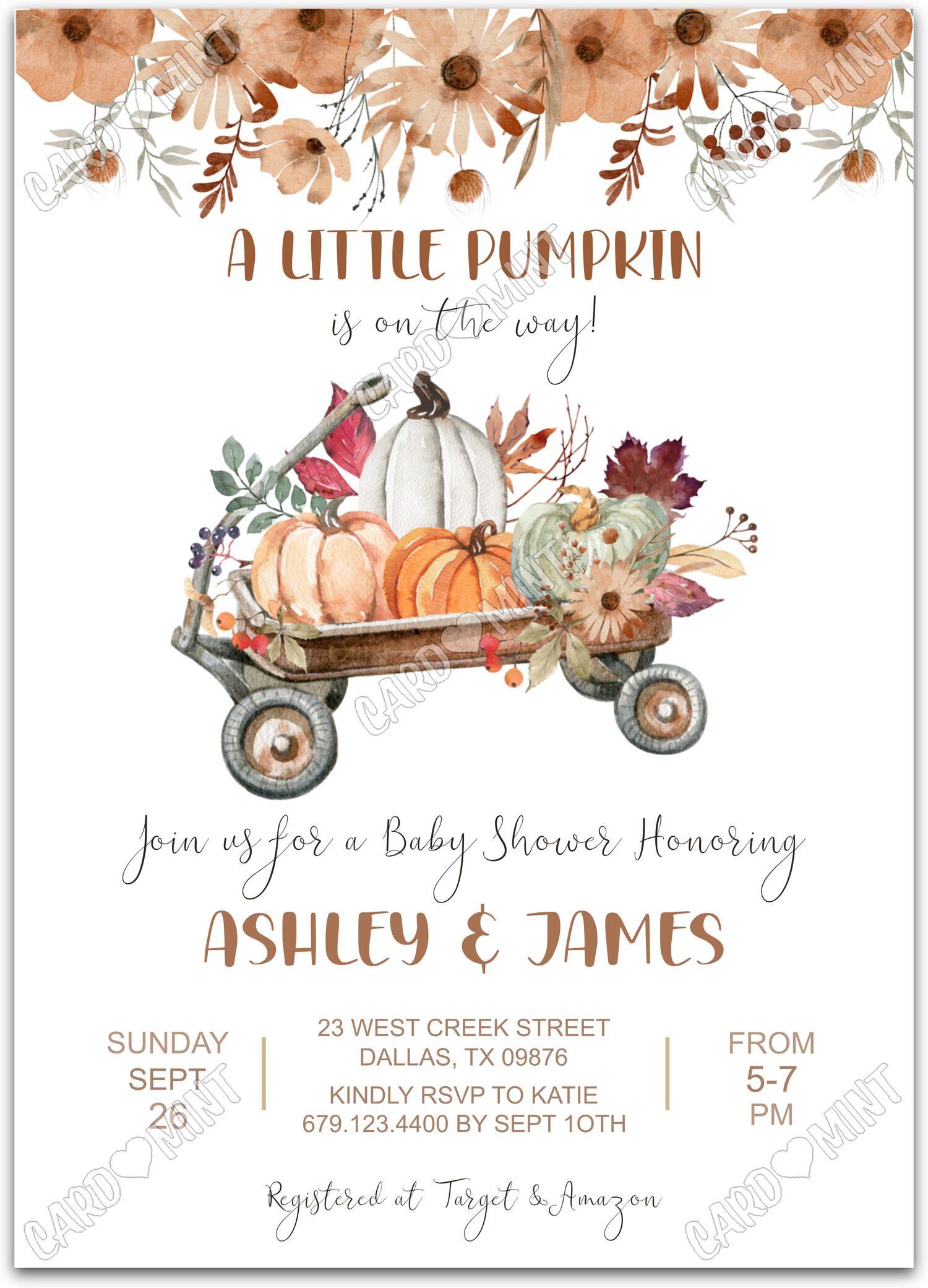 Host a successful baby shower starting with this fall pumpkins in wagon orange invite! The printed dimensions are 5"x7".