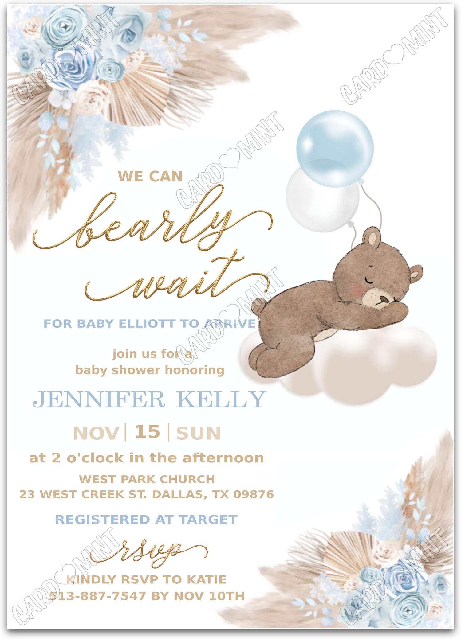 Celebrate your baby boy with our adorable shower invitation, featuring a teddy bear sleeping on a cloud with pampas grass. In beautiful baby blue floral hues, this "We Can Bearly Wait" invite includes a cute baby boy teddy bear, blue and beige accents, and a touch of minimalism for a stylish boy balloon shower.
