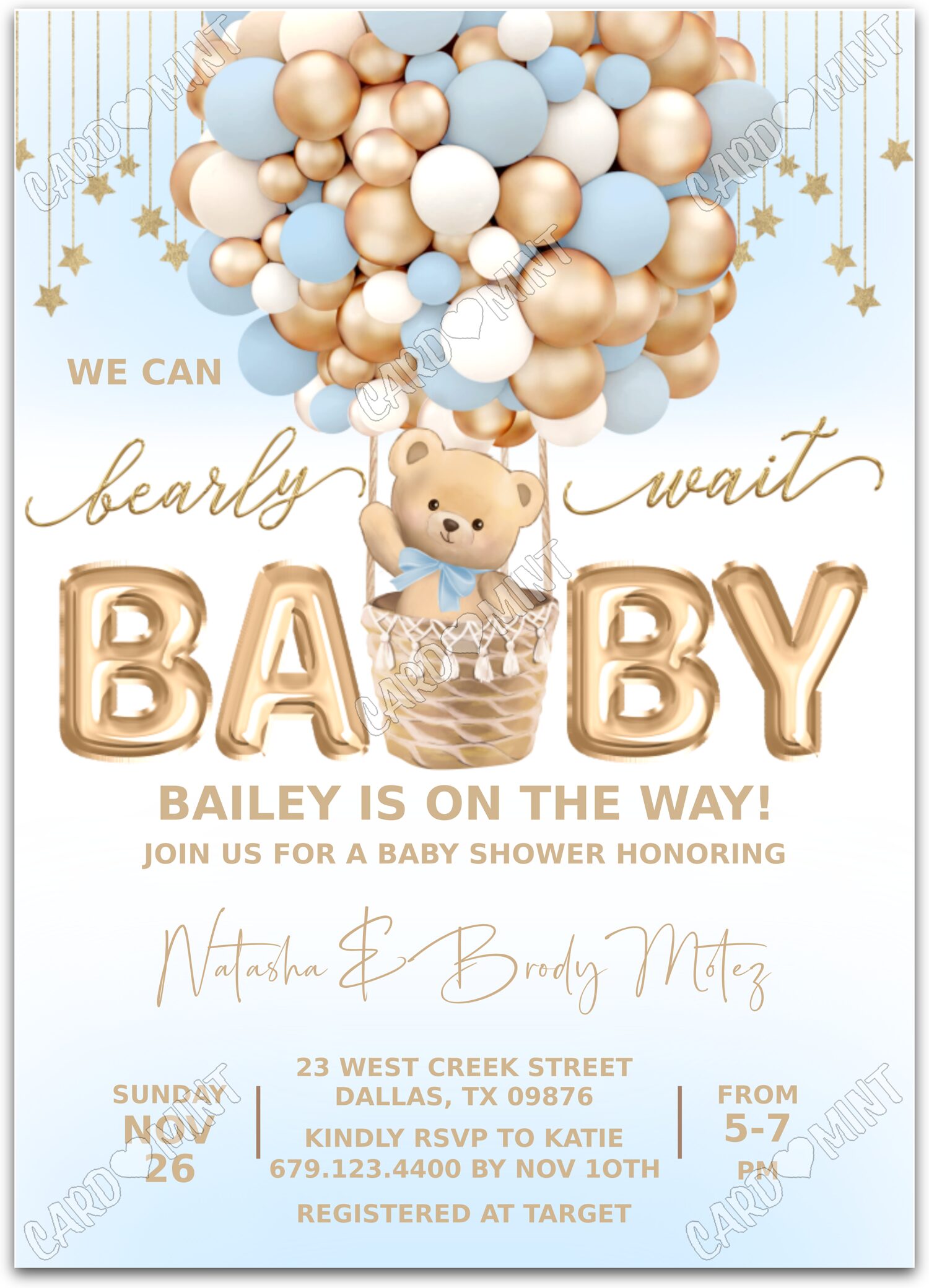 Host a successful baby shower starting with this teddy bear & hot air balloons blue/gold invite!