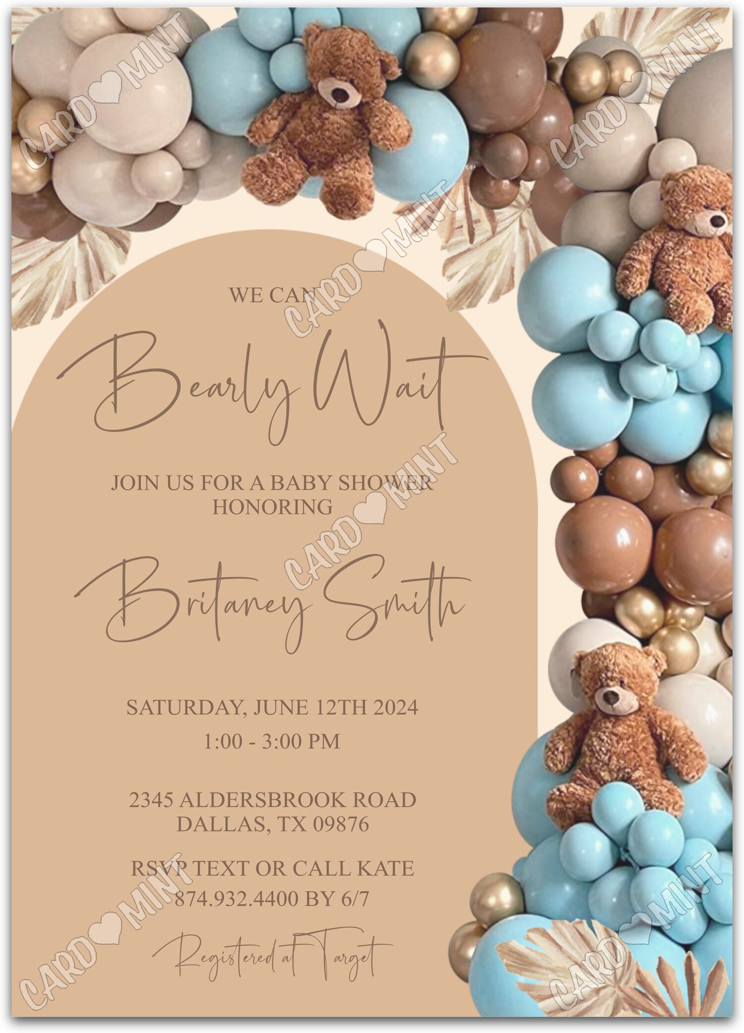 Host a successful baby shower starting with this teddy bear & balloons blue/tan invite! The printed dimensions are 5"x7".