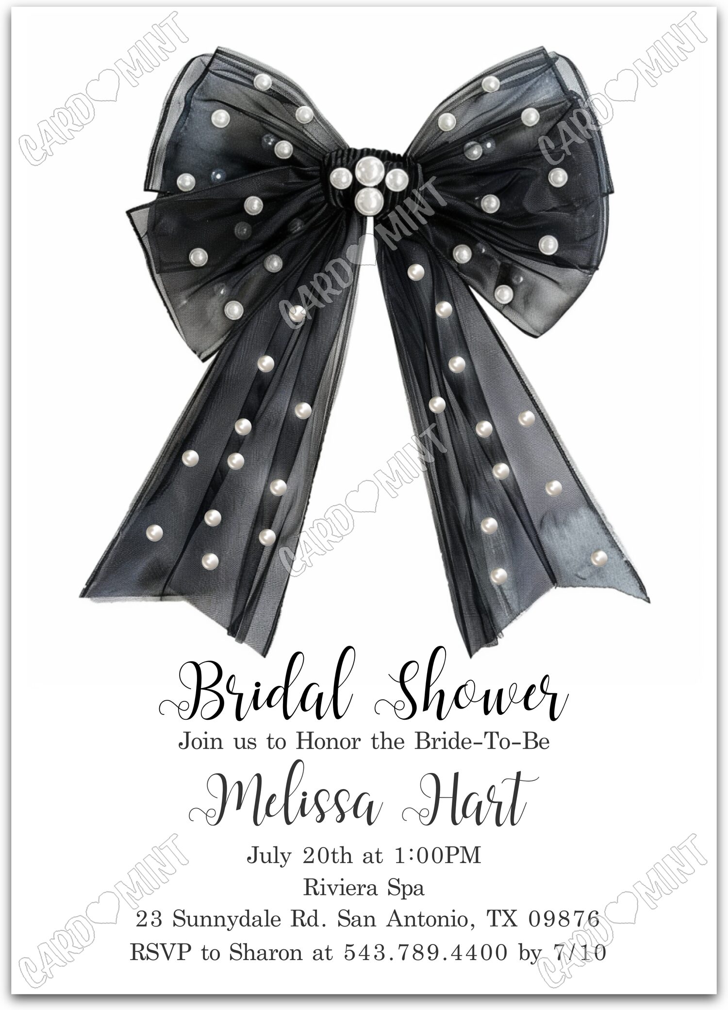 Host a successful bridal shower starting with this black bow & pearls white invite! The printed dimensions are 5"x7".