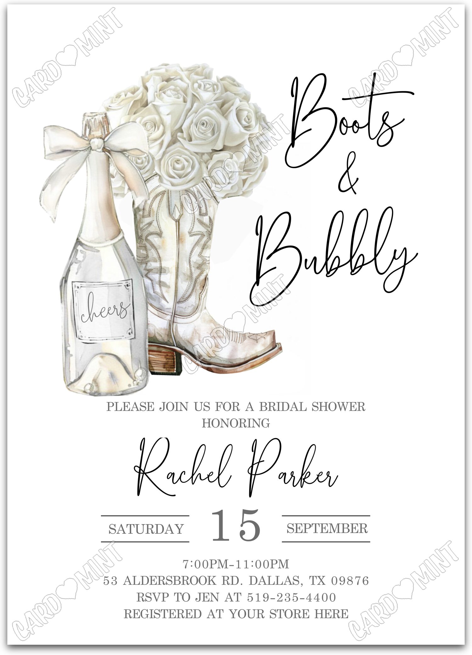 Host a successful bridal shower starting with this champagne, boots & white roses white invite! The printed dimensions are 5"x7".