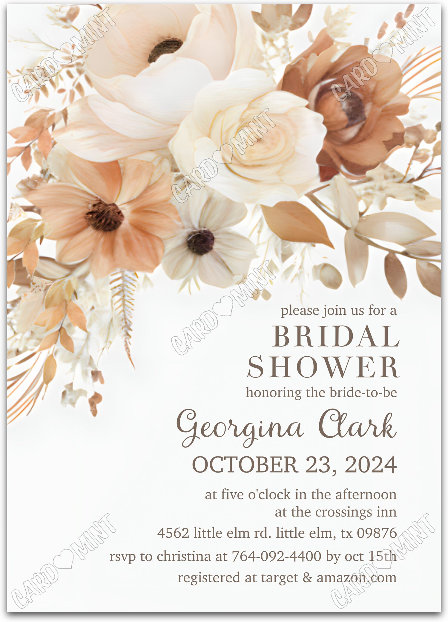 Host a successful bridal shower starting with this fall flowers white invite! The printed dimensions are 5"x7".