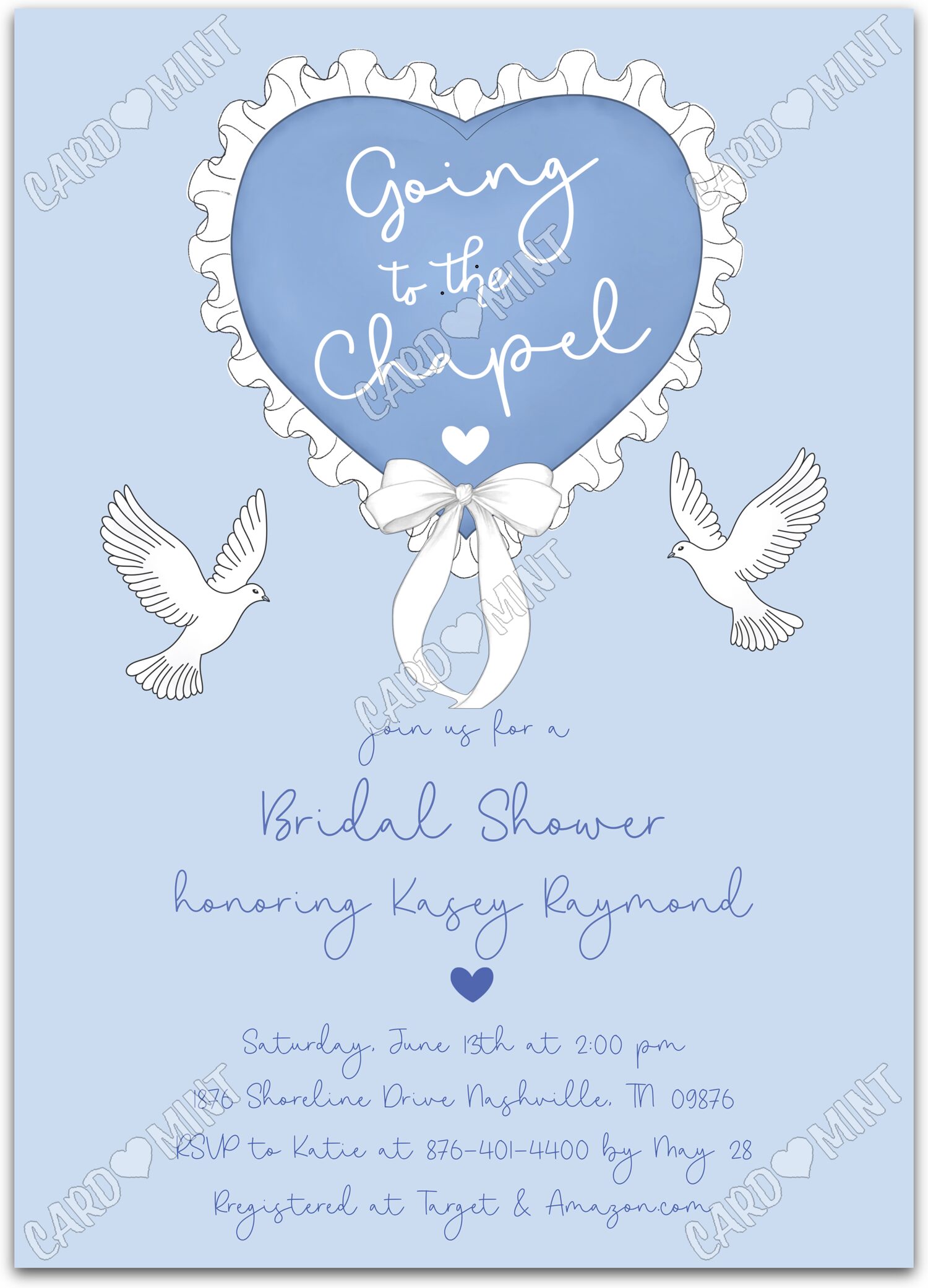Host a successful bridal shower starting with this white doves blue invite! The printed dimensions are 5"x7".