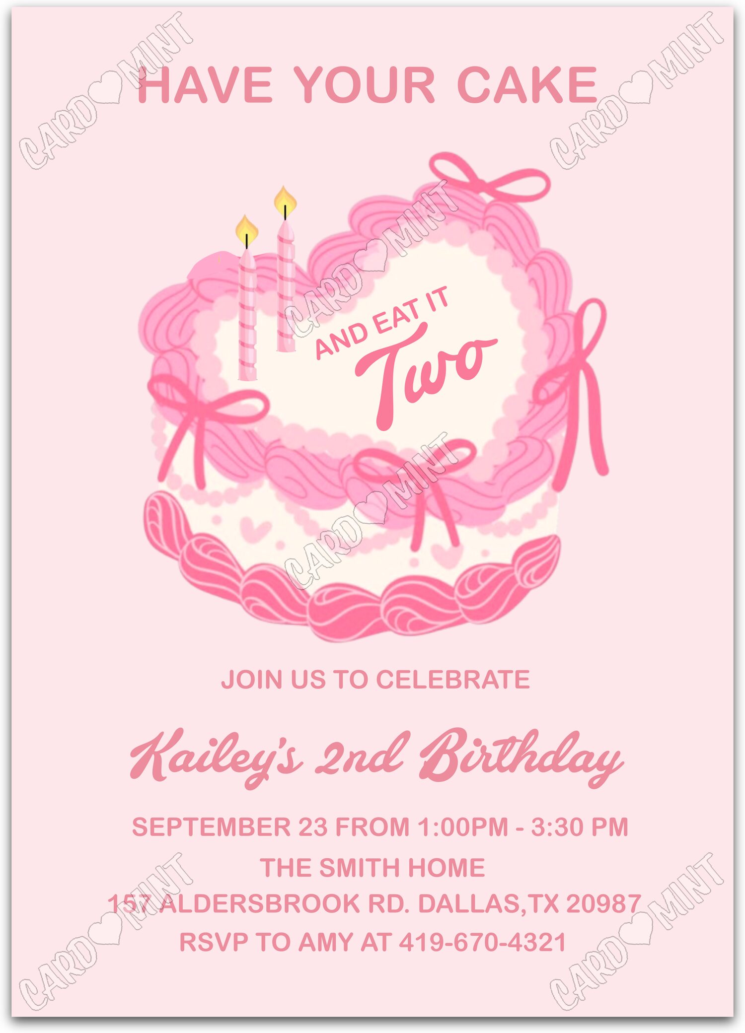 Host a successful 2nd birthday party starting with this cake with pink bows pink invite! The printed dimensions are 5"x7".