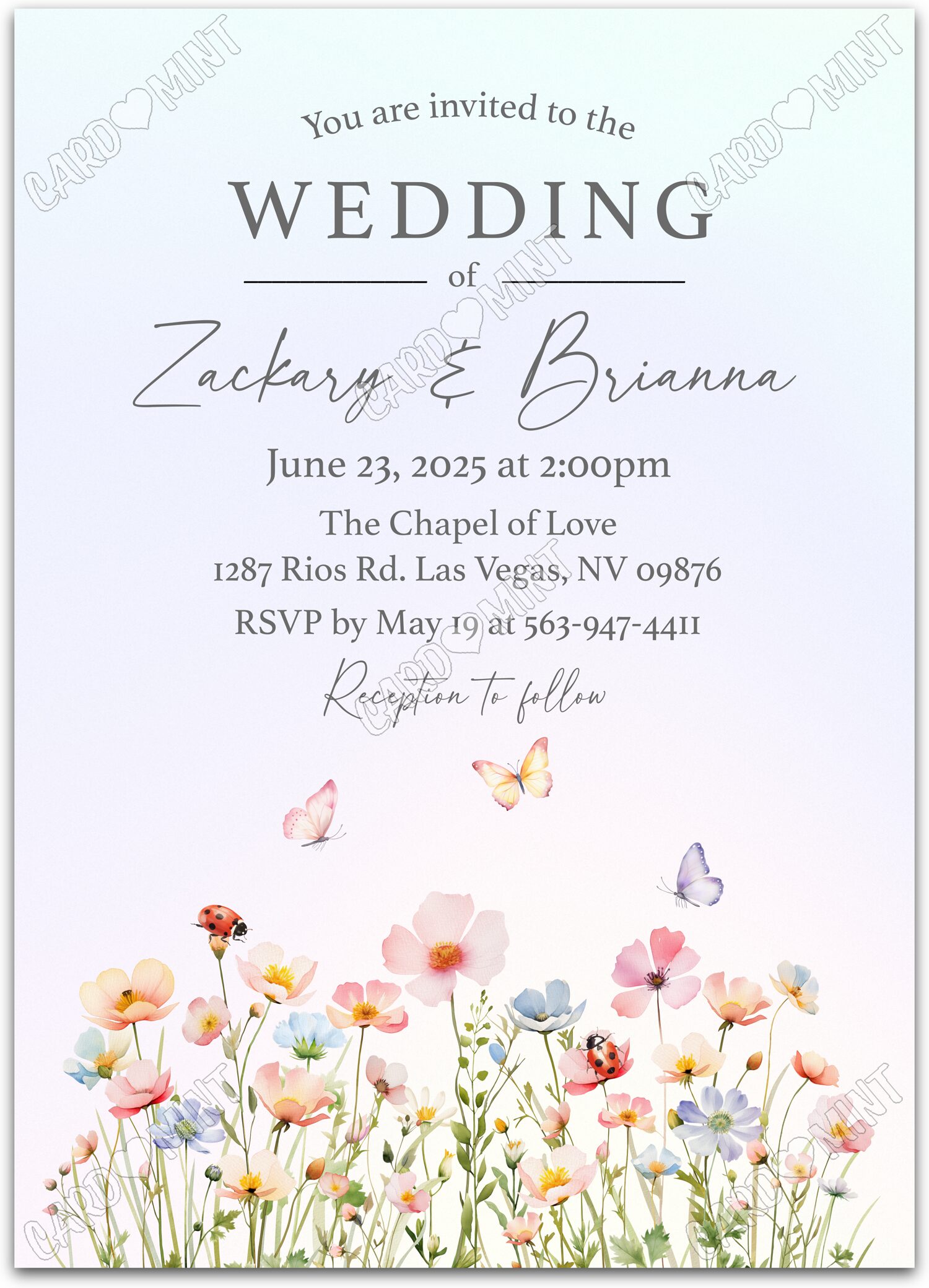 Host a successful wedding ceremony starting with this colorful wildflowers blue invite! The printed dimensions are 5"x7".
