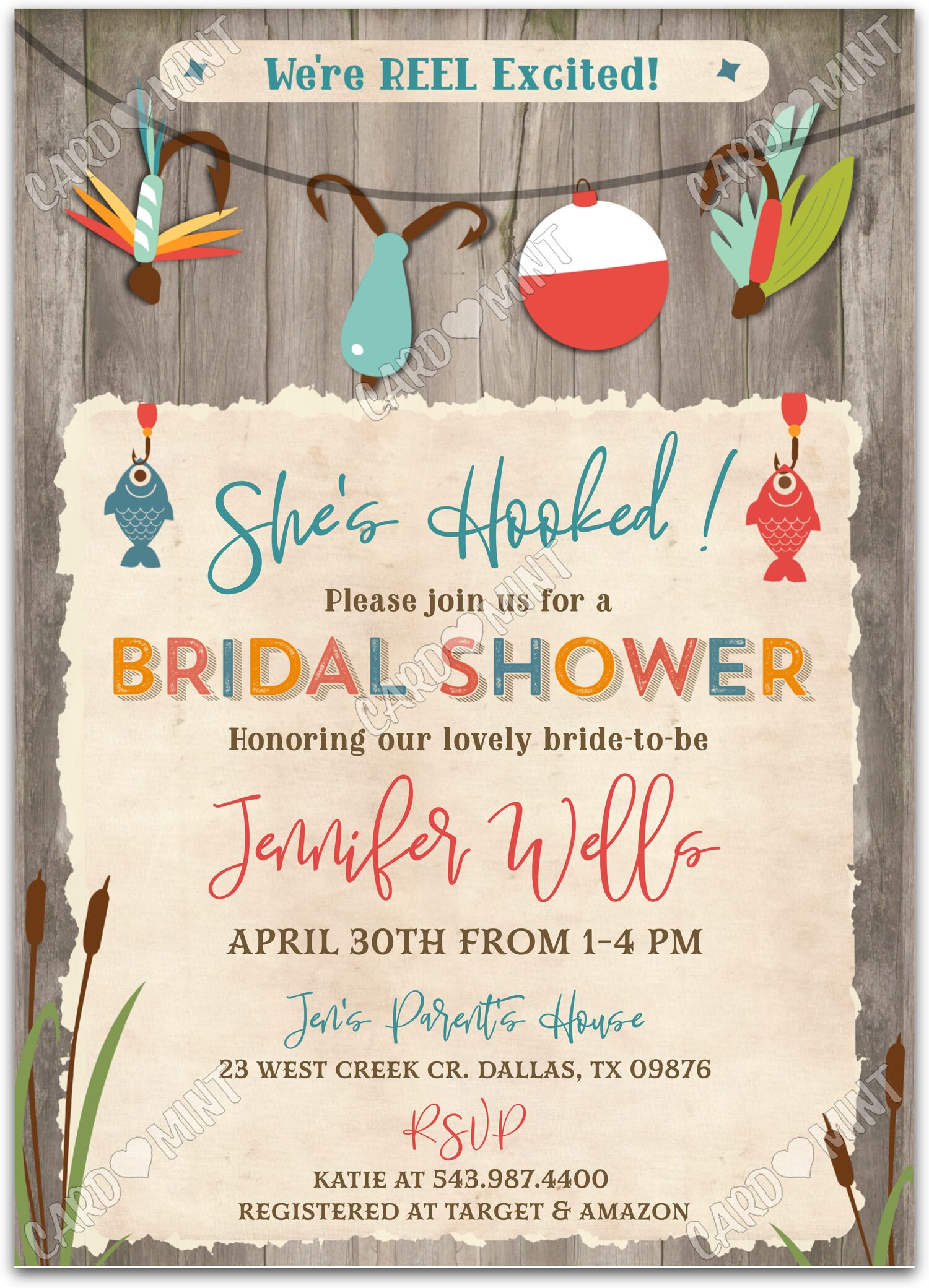 Host a successful bridal shower starting with this fishing tackle beige invite! The printed dimensions are 5"x7".