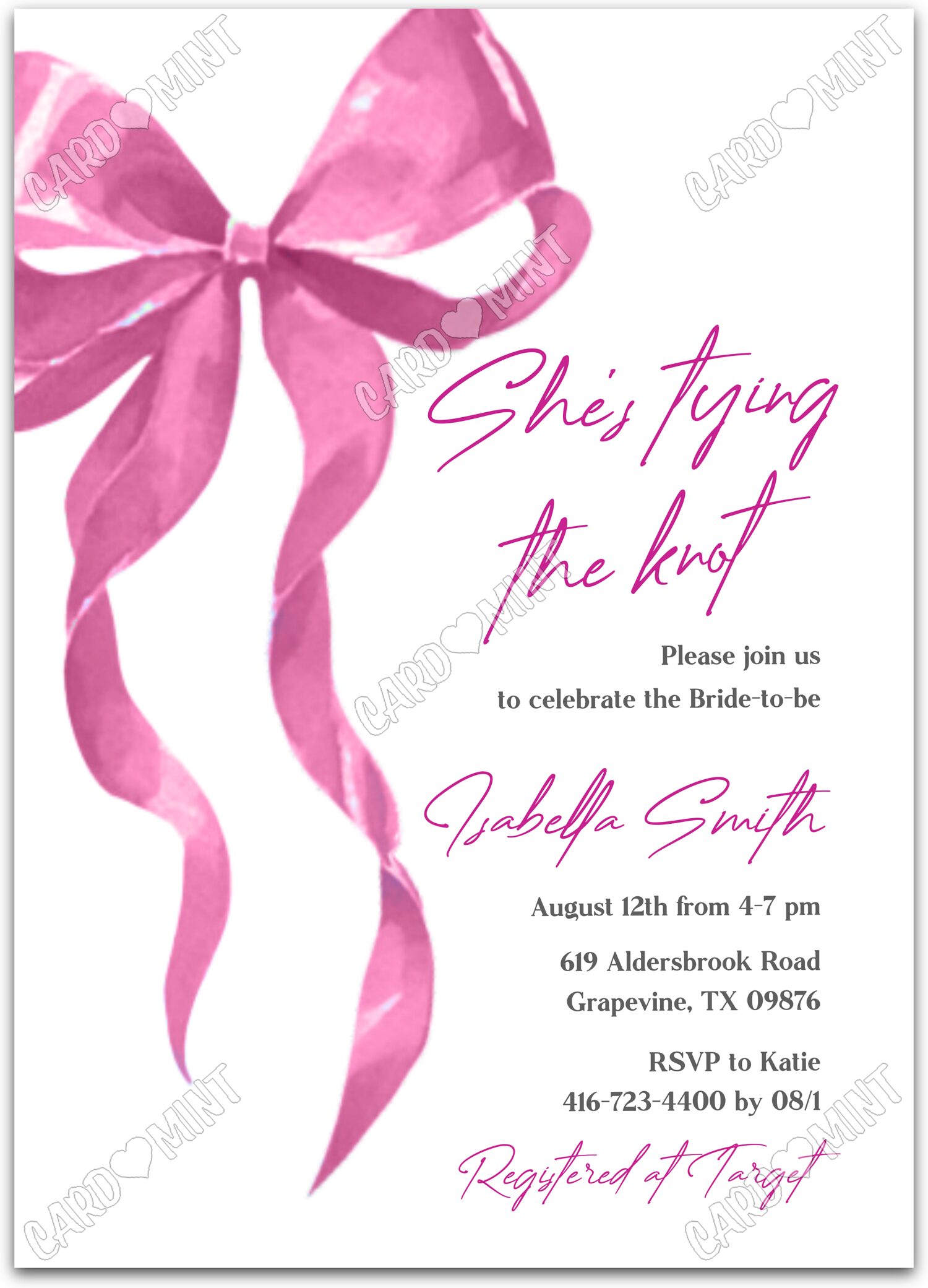 Host a successful bridal shower starting with this pink bow white invite! The printed dimensions are 5"x7".