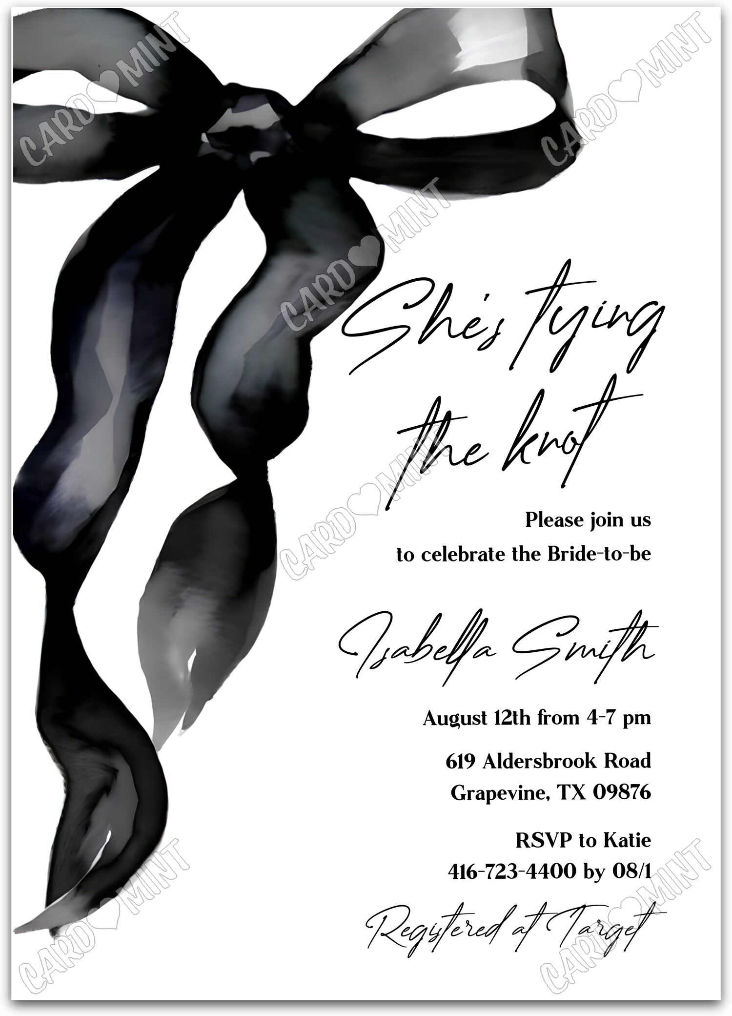 Host a successful bridal shower starting with this black bow white invite! The printed dimensions are 5"x7".
