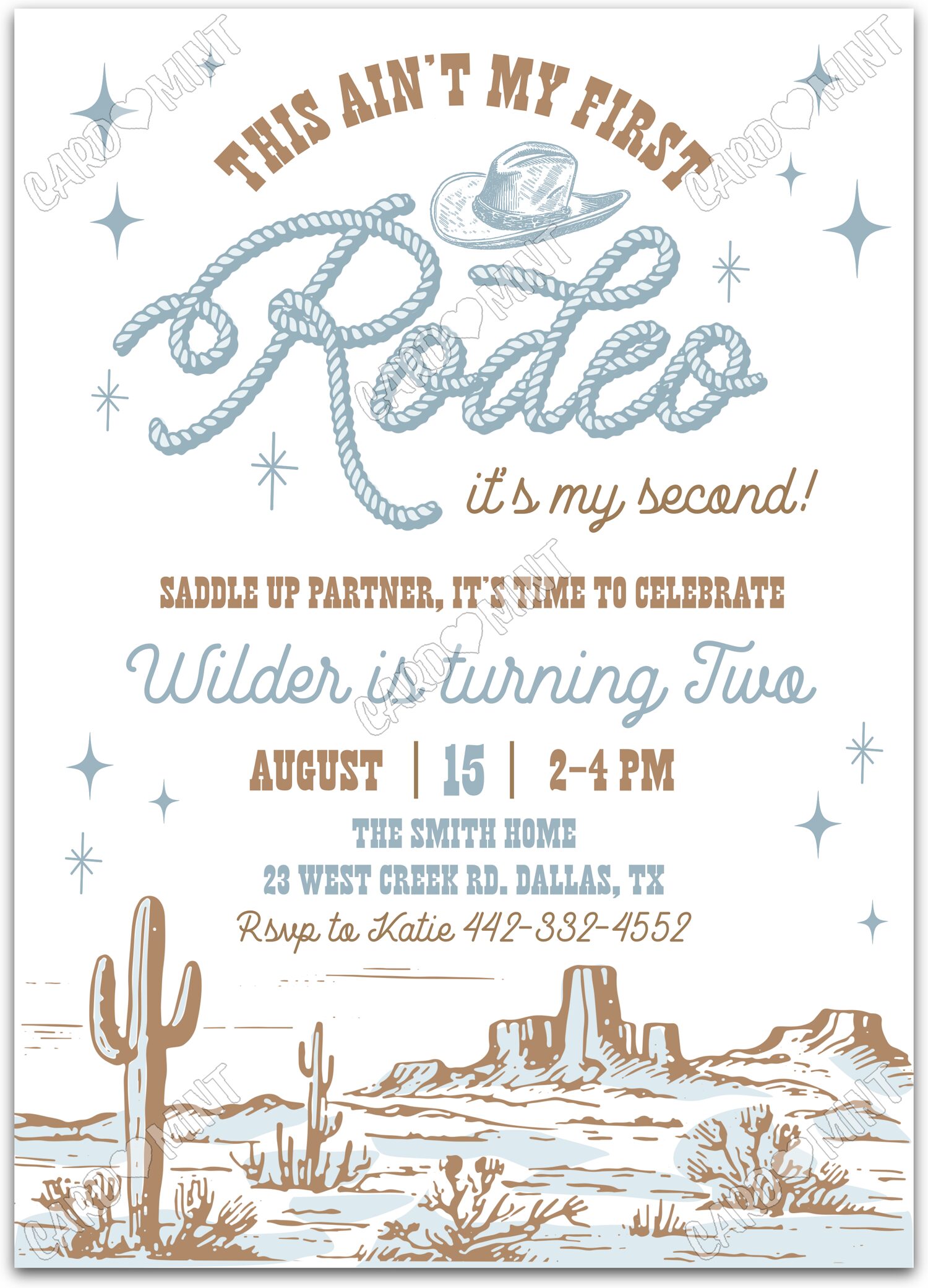 Host a successful 2nd birthday party starting with this cowboy desertscape white invite! The printed dimensions are 5"x7".