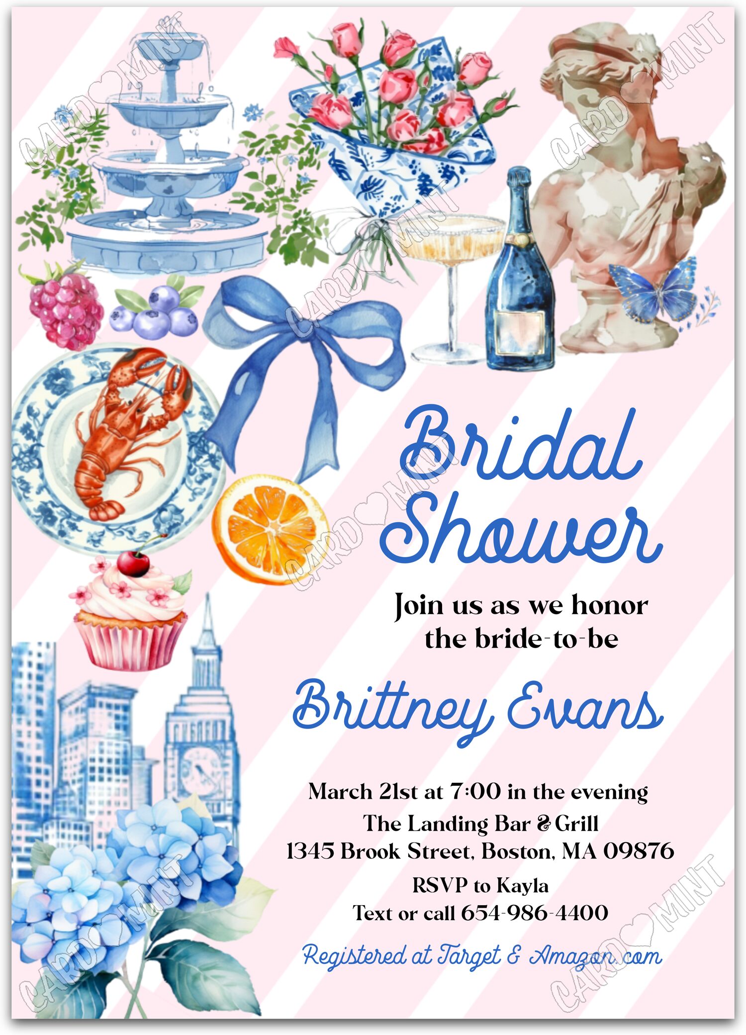 This product is sold to be used for one event and date. It is a digital product, produced in jpg and pdf (two per page) formats for printing and/or sharing as an evite by text, e-mail, or social media. No physical product will be sent unless printing is separately ordered. The product should be printed on regular white card stock or matte photo paper. You can print it yourself, use an office store such as Staples, a photo center such as Walmart or CVS, or Shutterfly. The image watermarks will be removed after purchase. Matching items such as thank you cards and favor tags are available for sale separately.